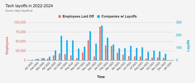 Graph: Layoffs from 2022-2024 (Source: Layoffs.FYI). Note that this is showing in-progress numbers for the current quarter.