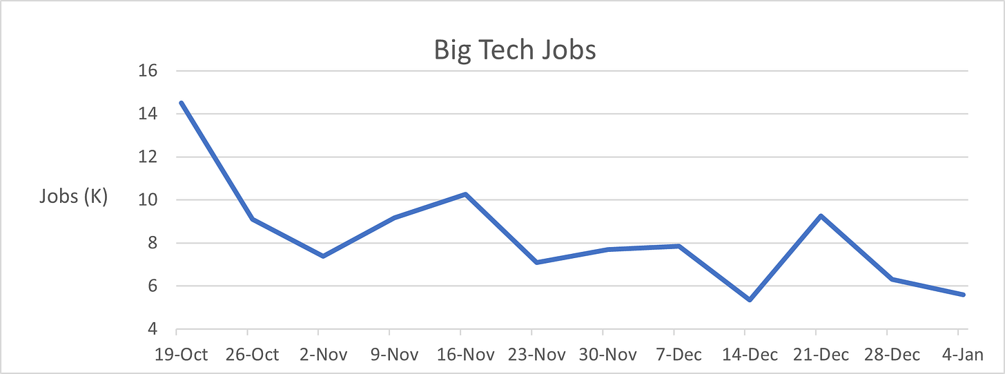 Big Tech Job Posts: LinkedIn has 5,601 (-11.1% WoW) US-based jobs for a group of 20 large firms (the ones I typically write about — Google, Apple, Netflix, etc.).