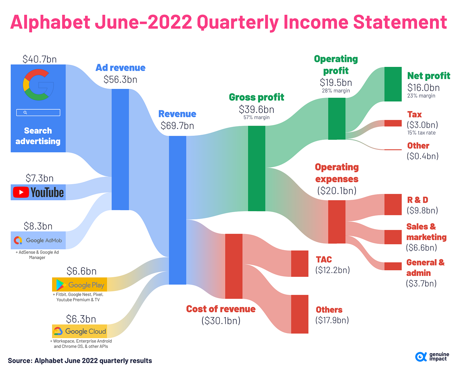 In the US digital ads space , there is ~$20B in annual revenue to publishers (i.e. Wall Street Journal, Twitter) . It comes from displaying more than 5 trillion digital ads – 13 billion per day! For Google globally, being the goliath of digital ads means $33.7B in revenue per year. This is 10%+ of their total revenue. Here’s a visual of their June 2022 quarterly results, where you can see how the pieces fit together for Google (note: stats above are annual and visual is quarterly).