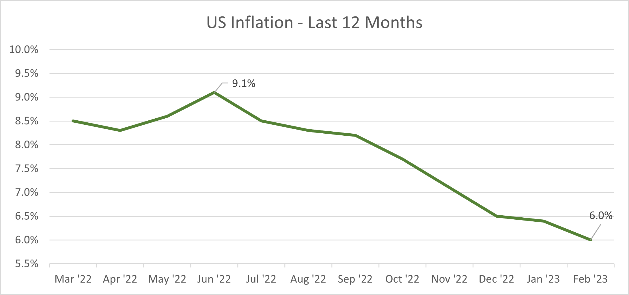 At the time, inflation was at 6.5% (Dec ‘22), down from a 9.1% peak (Jun ‘22). Since then, it’s continued to tick down to 6.0%… but at a slower pace.